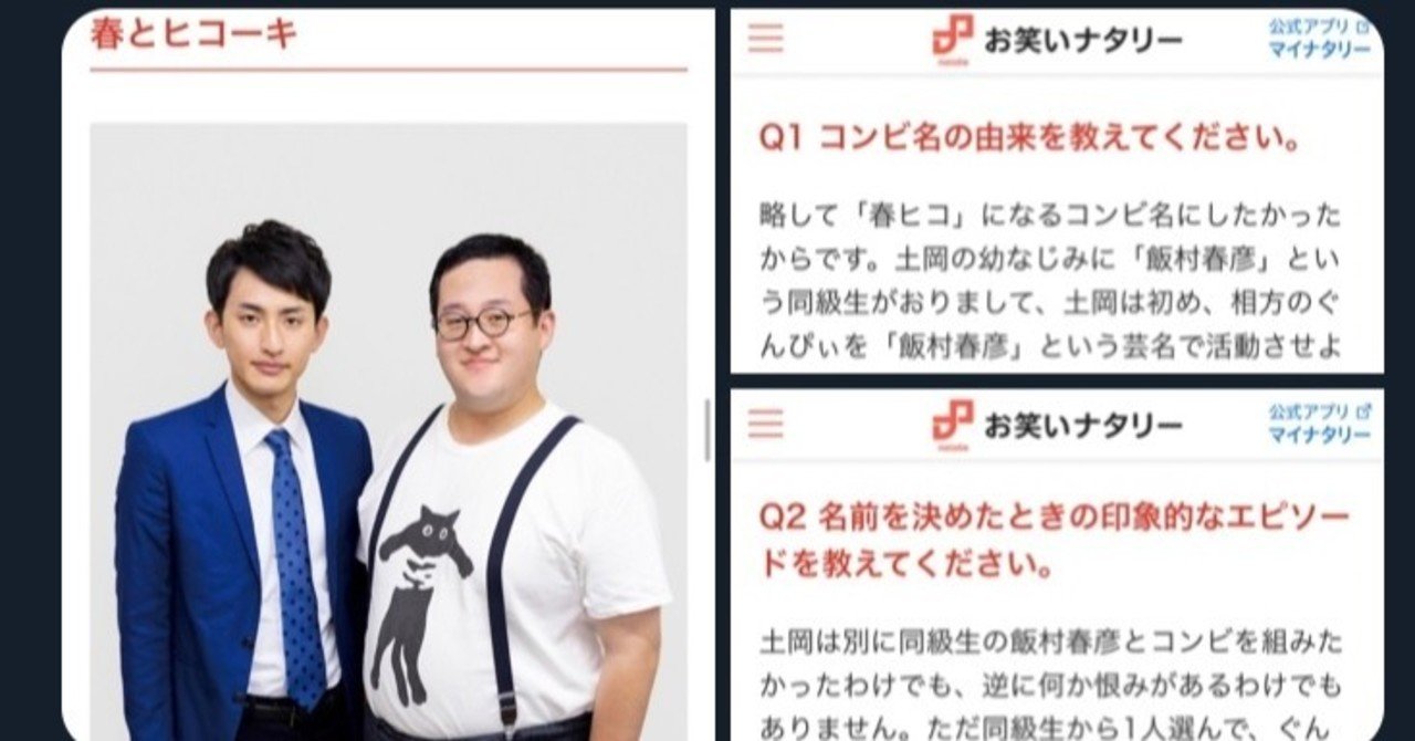 - 『春とヒコーキ』コンビ名の由来は、土岡さんの幼馴染「飯村晴彦」から「晴彦」をとって、コンビ名が略すと「春ヒコ」になるコンビ名にしたかったから